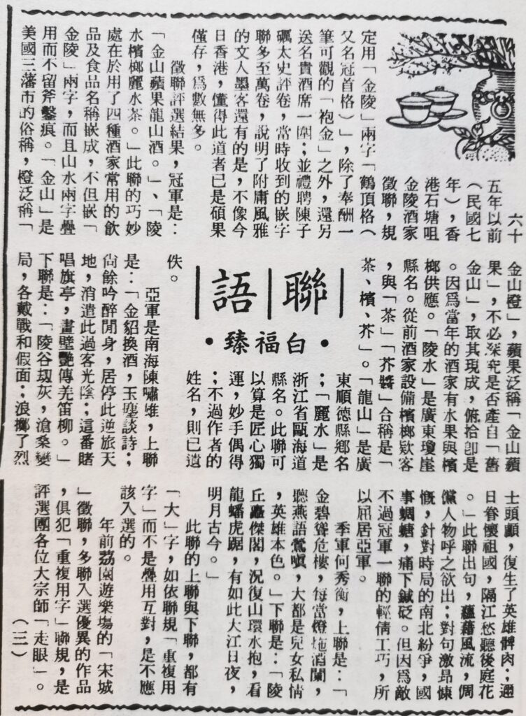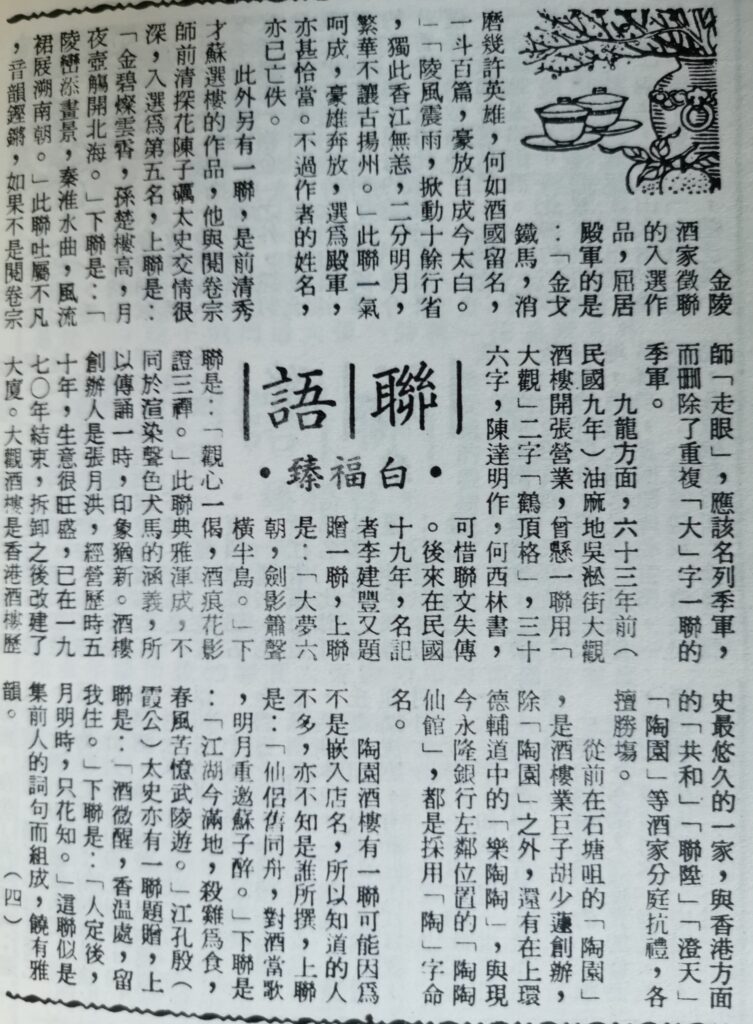 上接白福臻聯語(三) 金陵酒家徵聯的入選...