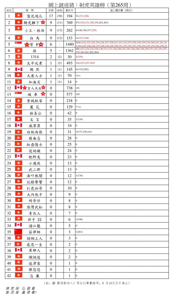 Continue Reading Previous 網上謎迷猜:第265周(提示)Next 網上謎迷猜:第266周 發佈留言 取消回覆發佈留言必須填寫的電子郵件地址不會公開。 必填欄位標示為 *留言 顯示名稱 * 電子郵件地址 * 個人網站網址 在瀏覽器中儲存顯示名稱、電子郵件地址及個人網站網址,以供下次發佈留言時使用。 More Stories 1 min read 燈謎文化站 燈謎迷 網上謎迷猜 網上謎迷猜:第388周 2025 年 12 月 12 日 admin 燈謎文化站 燈謎迷 網上謎迷猜 網上謎迷猜:第387周-射虎榜 2025 年 12 月 11 日 admin 1 min read 燈謎文化站 燈謎迷 網上謎迷猜 網上謎迷猜:第387周 2025 年 12 月 5 日 admin