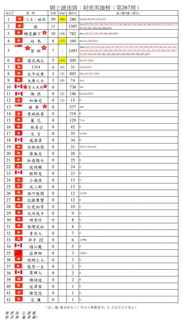 Continue Reading Previous 網上謎迷猜:第267周(提示)Next 網上謎迷猜:第268周 發佈留言 取消回覆發佈留言必須填寫的電子郵件地址不會公開。 必填欄位標示為 *留言 顯示名稱 * 電子郵件地址 * 個人網站網址 在瀏覽器中儲存顯示名稱、電子郵件地址及個人網站網址,以供下次發佈留言時使用。 More Stories 1 min read 燈謎文化站 燈謎迷 網上謎迷猜 網上謎迷猜:第388周 2025 年 12 月 12 日 admin 燈謎文化站 燈謎迷 網上謎迷猜 網上謎迷猜:第387周-射虎榜 2025 年 12 月 11 日 admin 1 min read 燈謎文化站 燈謎迷 網上謎迷猜 網上謎迷猜:第387周 2025 年 12 月 5 日 admin
