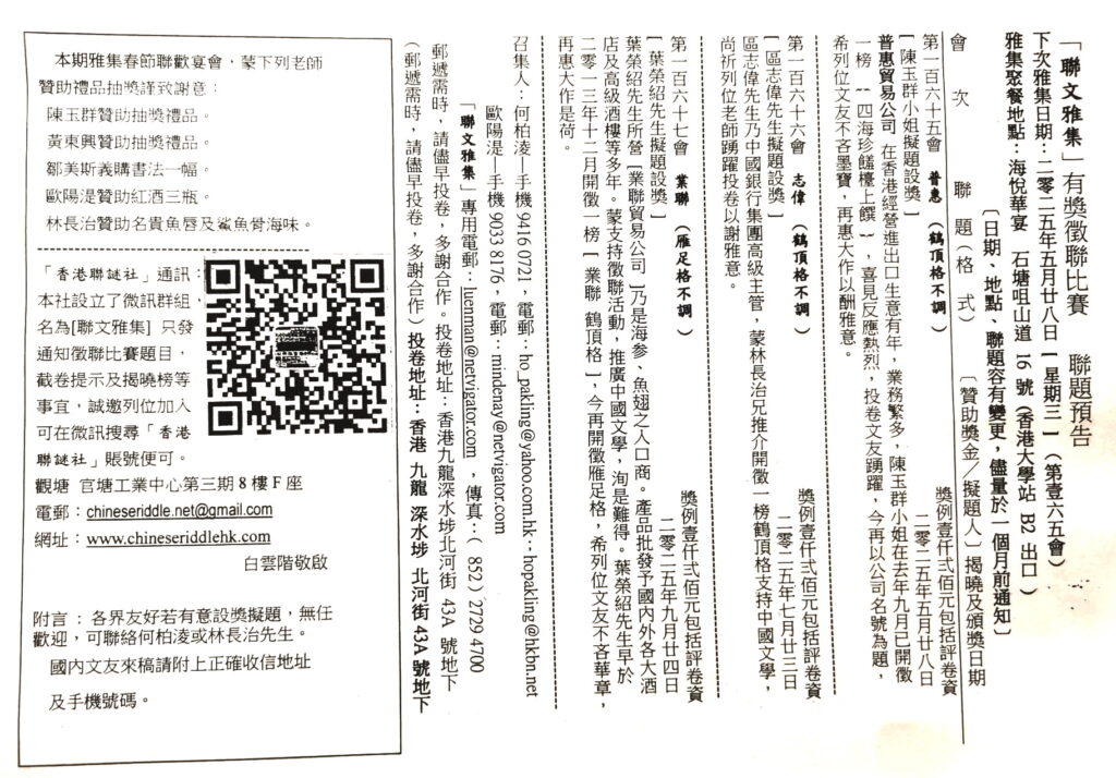 Continue Reading Previous 香港聯謎社 聯文雅集 第164會 -獎狀Next 香港聯謎社 聯文雅集 第164會 – 金榜 發佈留言 取消回覆發佈留言必須填寫的電子郵件地址不會公開。 必填欄位標示為 *留言 顯示名稱 * 電子郵件地址 * 個人網站網址 在瀏覽器中儲存顯示名稱、電子郵件地址及個人網站網址,以供下次發佈留言時使用。 More Stories 對聯戀 聯文雅集 轉載:聯文雅集 公告 2025 年 10 月 14 日 admin 對聯戀 燈謎文化站 燈謎迷 聯文雅集 懷念歐陽湜副主席 2025 年 10 月 3 日 admin 聯文雅集 第三十五屆全港詩詞創作比賽-律詩:頒獎典禮 2025 年 9 月 26 日 admin