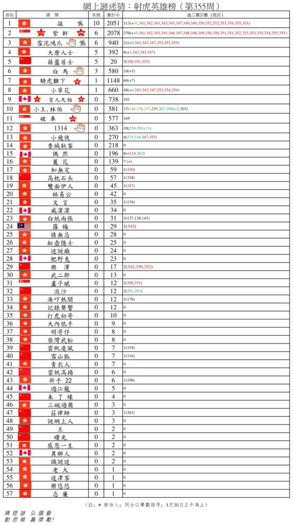 Continue Reading Previous 網上謎迷猜:第355周Next 網上謎迷猜:第356周 發佈留言 取消回覆發佈留言必須填寫的電子郵件地址不會公開。 必填欄位標示為 *留言 顯示名稱 * 電子郵件地址 * 個人網站網址 在瀏覽器中儲存顯示名稱、電子郵件地址及個人網站網址,以供下次發佈留言時使用。 More Stories 1 min read 燈謎文化站 燈謎迷 網上謎迷猜 網上謎迷猜:第388周 2025 年 12 月 12 日 admin 燈謎文化站 燈謎迷 網上謎迷猜 網上謎迷猜:第387周-射虎榜 2025 年 12 月 11 日 admin 1 min read 燈謎文化站 燈謎迷 網上謎迷猜 網上謎迷猜:第387周 2025 年 12 月 5 日 admin