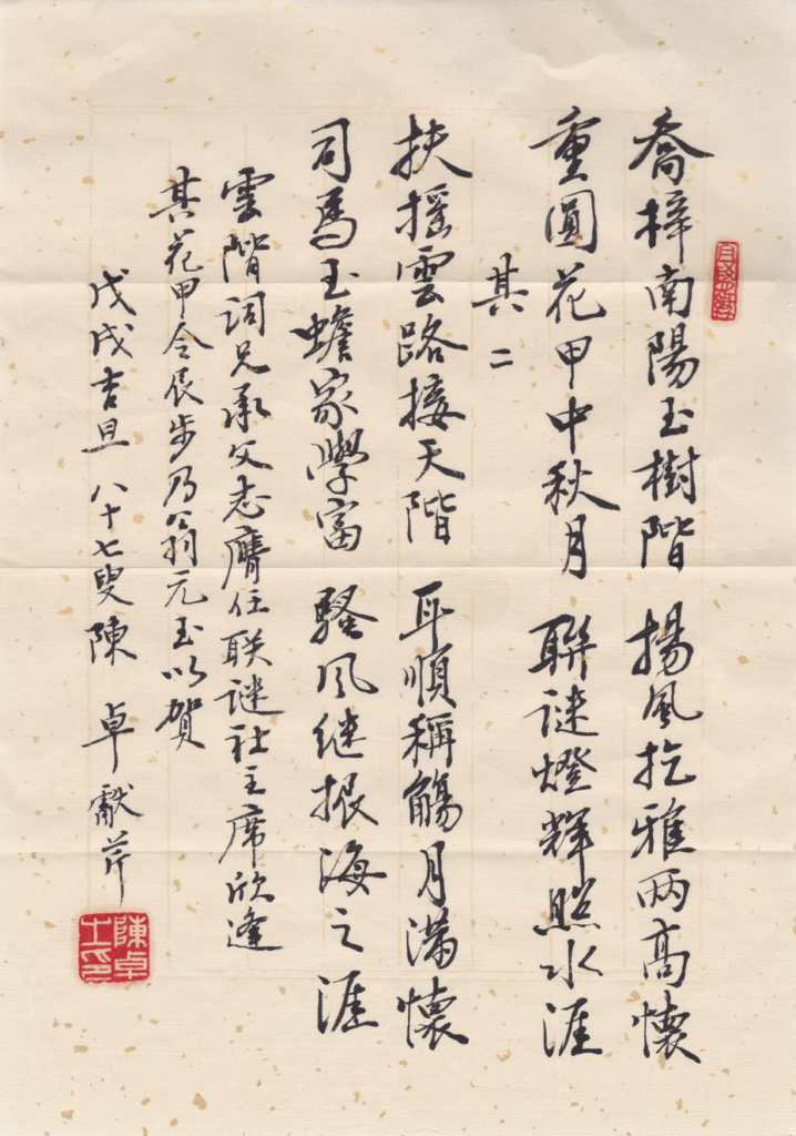 去年籌備將父親和我往年謎作結集刊印,邀他作序,他用不了多久看完初稿便擬好了序。內容精簡,並交代來龍去脈,還引用不少初稿內容作為例子,足見他雖然已九十三高齡,仍然心思縝密,文路清晰,而且速度驚人。他還告訴我這篇序是他最用功夫寫的一篇。可惜出版還未獲批,他老人家已仙遊去了。
