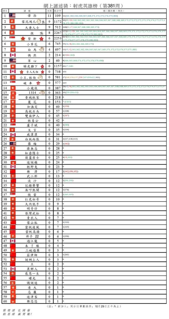Continue Reading Previous 網上謎迷猜:第381周 發佈留言 取消回覆發佈留言必須填寫的電子郵件地址不會公開。 必填欄位標示為 *留言 顯示名稱 * 電子郵件地址 * 個人網站網址 在瀏覽器中儲存顯示名稱、電子郵件地址及個人網站網址,以供下次發佈留言時使用。 More Stories 1 min read 燈謎文化站 燈謎迷 網上謎迷猜 網上謎迷猜:第381周 2025 年 10 月 24 日 admin 燈謎文化站 燈謎迷 網上謎迷猜 網上謎迷猜:第380周-射虎榜 2025 年 10 月 23 日 admin 燈謎文化站 燈謎迷 網上謎迷猜 乙 巳 深 秋 謎 會 2025 年 10 月 22 日 admin