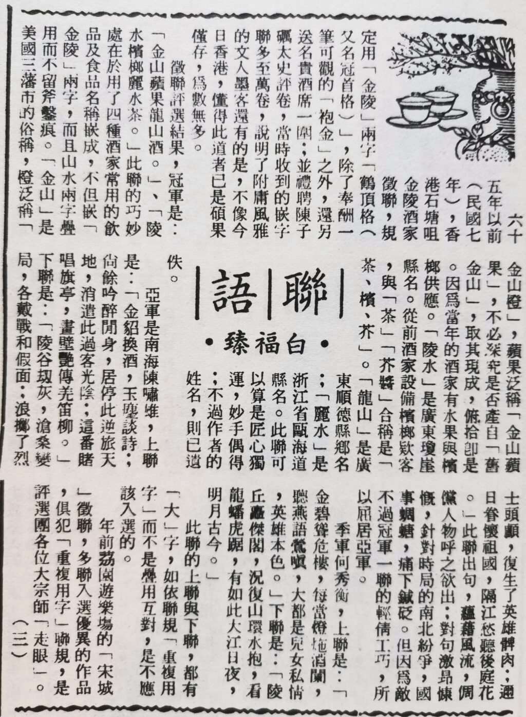 六十五年以前(民國七年),香港石塘嘴金陵酒家徵聯,規定用「金陵」兩字「鶴頂格(又名冠首格)」,除了奉酬一筆可觀的「袍金」外,還另送名貴酒席一圍;並禮聘陳子礪太史評卷,當時收到的嵌字聯多至萬卷,說明了附庸風雅的文人墨客還有的是,不像今日香港,懂得此道者已是碩果僅存,爲數無多。