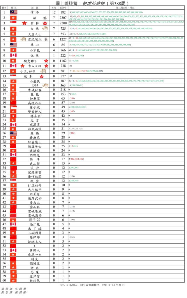 Continue Reading Previous 網上謎迷猜:第388周 發佈留言 取消回覆發佈留言必須填寫的電子郵件地址不會公開。 必填欄位標示為 *留言 顯示名稱 * 電子郵件地址 * 個人網站網址 在瀏覽器中儲存顯示名稱、電子郵件地址及個人網站網址,以供下次發佈留言時使用。 More Stories 1 min read 燈謎文化站 燈謎迷 網上謎迷猜 網上謎迷猜:第388周 2025 年 12 月 12 日 admin 燈謎文化站 燈謎迷 網上謎迷猜 網上謎迷猜:第387周-射虎榜 2025 年 12 月 11 日 admin 1 min read 燈謎文化站 燈謎迷 網上謎迷猜 網上謎迷猜:第387周 2025 年 12 月 5 日 admin