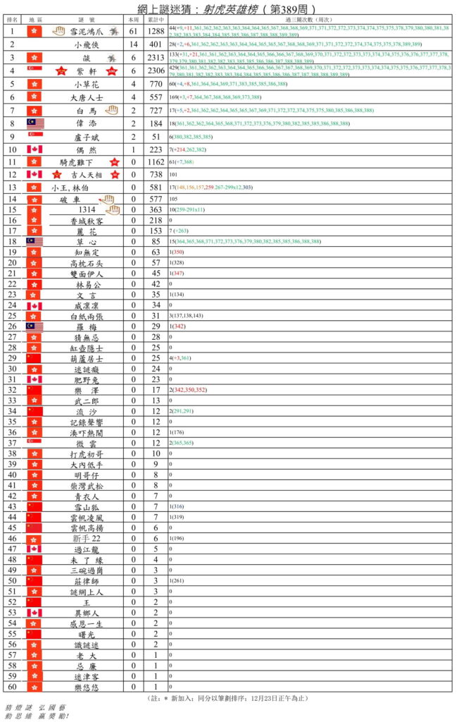Continue Reading Previous 網上謎迷猜:第389周 發佈留言 取消回覆發佈留言必須填寫的電子郵件地址不會公開。 必填欄位標示為 *留言 顯示名稱 * 電子郵件地址 * 個人網站網址 在瀏覽器中儲存顯示名稱、電子郵件地址及個人網站網址,以供下次發佈留言時使用。 More Stories 1 min read 燈謎文化站 燈謎迷 網上謎迷猜 網上謎迷猜:第389周 2025 年 12 月 19 日 admin 燈謎文化站 燈謎迷 網上謎迷猜 網上謎迷猜:第388周-射虎榜 2025 年 12 月 18 日 admin 1 min read 燈謎文化站 燈謎迷 網上謎迷猜 網上謎迷猜:第388周 2025 年 12 月 12 日 admin