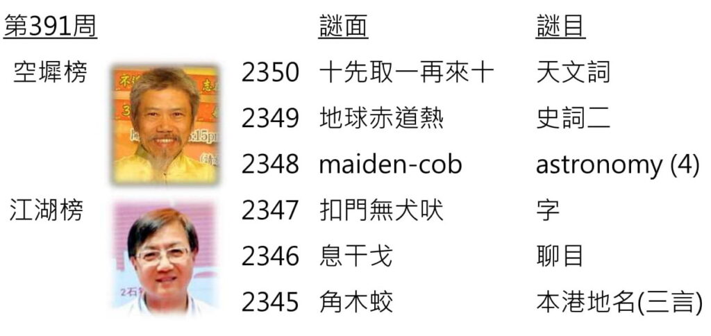 除今周公佈的謎題,過往各周的也可繼續競猜(請參閱:「網上謎迷猜」全謎陣),成績同樣上榜累計,日後將陸續增設獎項,志在: