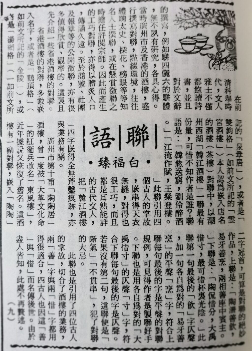 在前清科舉時代,文人雅士不僅飽讀詩書,對於文辭的撰寫,例如駢四儷六的駢體,無不夙有研究,各具心得。當時廣州市及香港的酒樓,盛行撰寫對聯,㸃綴環境,往往禮聘太史、探花、榜眼等等知名人士撰聯,或在懸賞徵聯之時擔任評閱宗師。因此而產生的工巧對聯,亦得以膾炙人口,傳誦久遠。