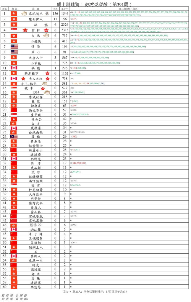 Continue Reading Previous 誠邀:丙午春季謎會Next 網上謎迷猜:第392周 發佈留言 取消回覆發佈留言必須填寫的電子郵件地址不會公開。 必填欄位標示為 *留言 顯示名稱 * 電子郵件地址 * 個人網站網址 在瀏覽器中儲存顯示名稱、電子郵件地址及個人網站網址,以供下次發佈留言時使用。 More Stories 1 min read 燈謎文化站 燈謎迷 網上謎迷猜 網上謎迷猜:第392周 2026 年 1 月 9 日 admin 燈謎文化站 燈謎會 燈謎迷 誠邀:丙午春季謎會 2026 年 1 月 6 日 admin 1 min read 燈謎文化站 燈謎迷 網上謎迷猜 網上謎迷猜:第391周 2026 年 1 月 2 日 admin