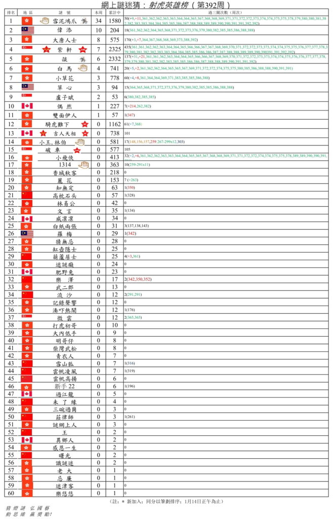 Continue Reading Previous 網上謎迷猜:第392周 發佈留言 取消回覆發佈留言必須填寫的電子郵件地址不會公開。 必填欄位標示為 *留言 顯示名稱 * 電子郵件地址 * 個人網站網址 在瀏覽器中儲存顯示名稱、電子郵件地址及個人網站網址,以供下次發佈留言時使用。 More Stories 1 min read 燈謎文化站 燈謎迷 網上謎迷猜 網上謎迷猜:第392周 2026 年 1 月 9 日 admin 燈謎文化站 燈謎迷 網上謎迷猜 網上謎迷猜:第391周-射虎榜 2026 年 1 月 8 日 admin 燈謎文化站 燈謎會 燈謎迷 誠邀:丙午春季謎會 2026 年 1 月 6 日 admin