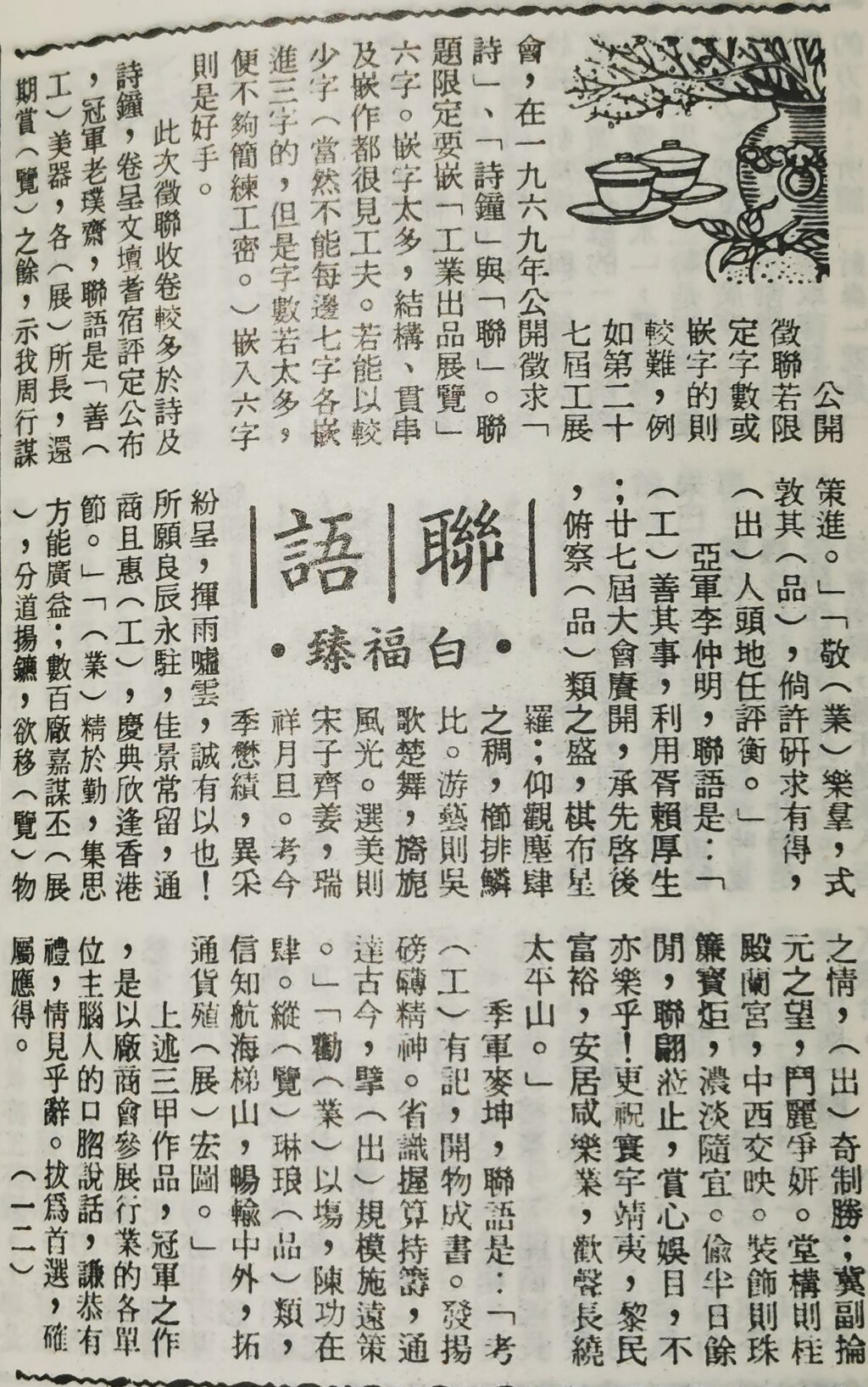 此次徵聯收卷較多於詩及詩鐘,卷呈文壇耆宿評定公布,冠軍老璞齋,聯語是「善(工)美器,各(展)所長,還期賞(覽)之餘,示我周行謀策進」,「敬(業)樂羣,式敦其(品),倘許研求有得,(出)人頭地任評衡」。