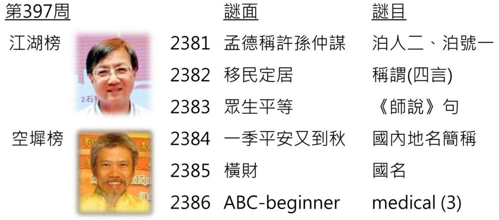 網上謎迷猜:第395周-射虎榜