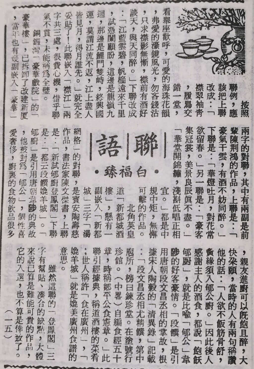 銅鑼灣「豪華戲院」的「豪華樓」,已拆卸了改建新厦,當年也有幾副嵌入「豪華」兩字的對聯,其中有兩副是前輩陳荆鴻的作品,上聯是:「豪氣干雲,有酒不妨同醉」,下聯是:「華燈吐月,對花常欲留春」。另一聯是:「豪客集冠裳,美景良辰眞不盡」,「華堂開錦繡,淺斟低唱正相宜」都是中規中矩,無懈可擊的作品。