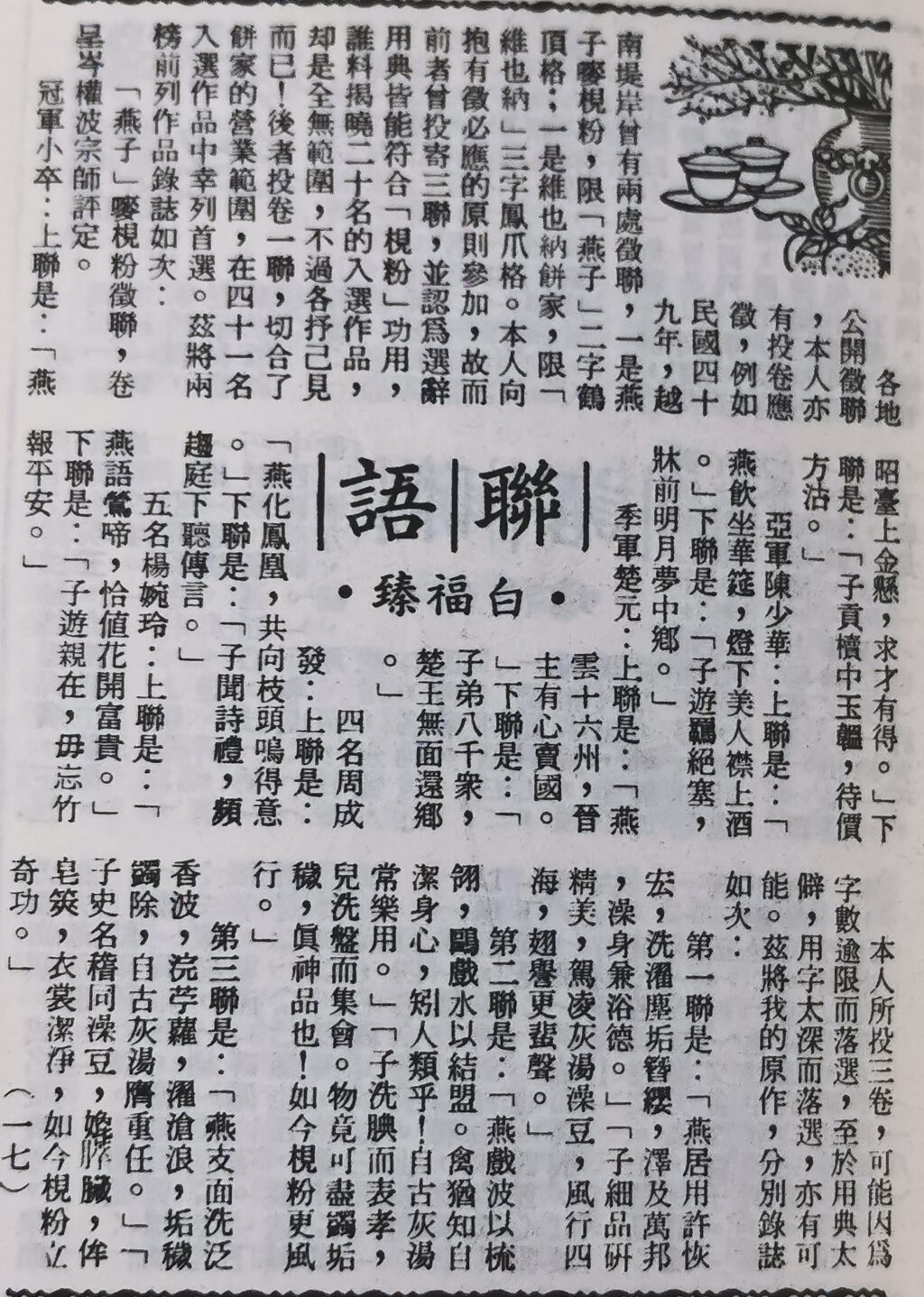 「燕子」嘜梘粉徵聯,卷呈岑權波宗師評定。冠軍小卒,上聯是:「燕昭臺上金懸,求才有得」,下聯是:「子貢櫝中玉韞,待價方沽」。亞軍陳少華,上聯是:「燕飲坐華筵,燈下美人襟上酒」,下聯是:「子遊羈絕塞,牀前明月夢中鄉」
