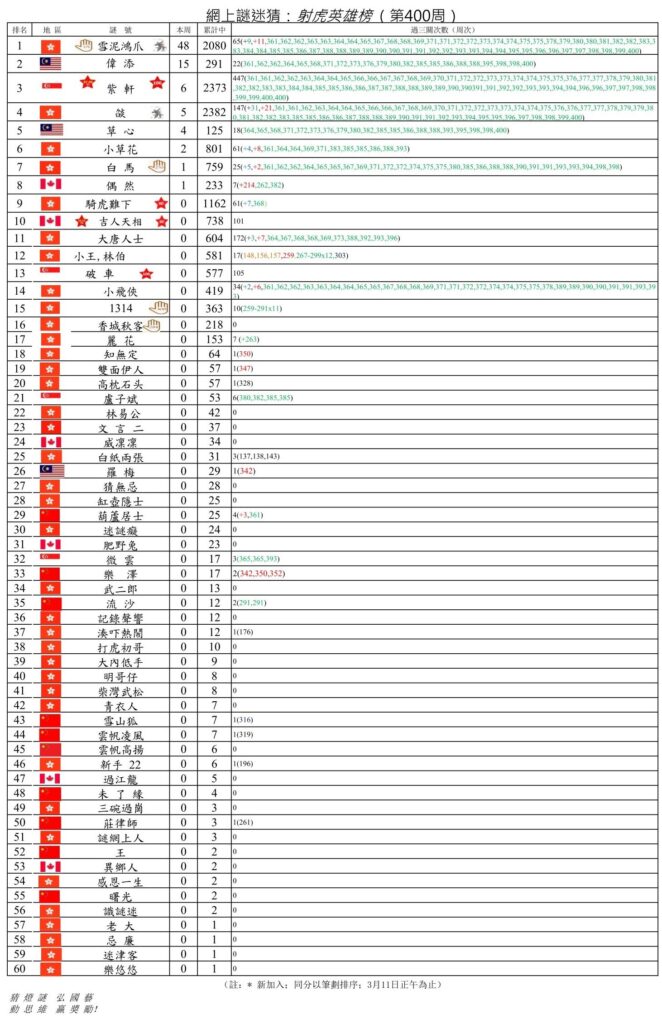 Continue Reading Previous 網上謎迷猜 跨進第七年 發佈留言 取消回覆發佈留言必須填寫的電子郵件地址不會公開。 必填欄位標示為 *留言 顯示名稱 * 電子郵件地址 * 個人網站網址 在瀏覽器中儲存顯示名稱、電子郵件地址及個人網站網址,以供下次發佈留言時使用。 More Stories 1 min read 燈謎文化站 燈謎迷 網上謎迷猜 網上謎迷猜 跨進第七年 2026 年 3 月 6 日 admin 1 min read 燈謎文化站 燈謎迷 網上謎迷猜 網上謎迷猜:第400周 2026 年 3 月 6 日 admin 燈謎文化站 燈謎迷 網上謎迷猜 網上謎迷猜:第399周-射虎榜 2026 年 3 月 5 日 admin