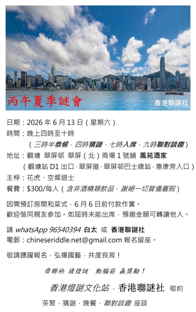 聯貴清新 言有物 發乎情 聲叶字工詞忌砌  謎宜雅俗 創於今 沿自古 格嚴意切句須通 -永遠社長 白福臻 (1924-2011)