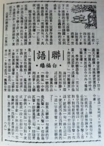 聯貴清新 言有物 發乎情 聲叶字工詞忌砌 謎宜雅俗 創於今 沿自古 格嚴意切句須通 -永遠社長 白福臻 (1924-2011)