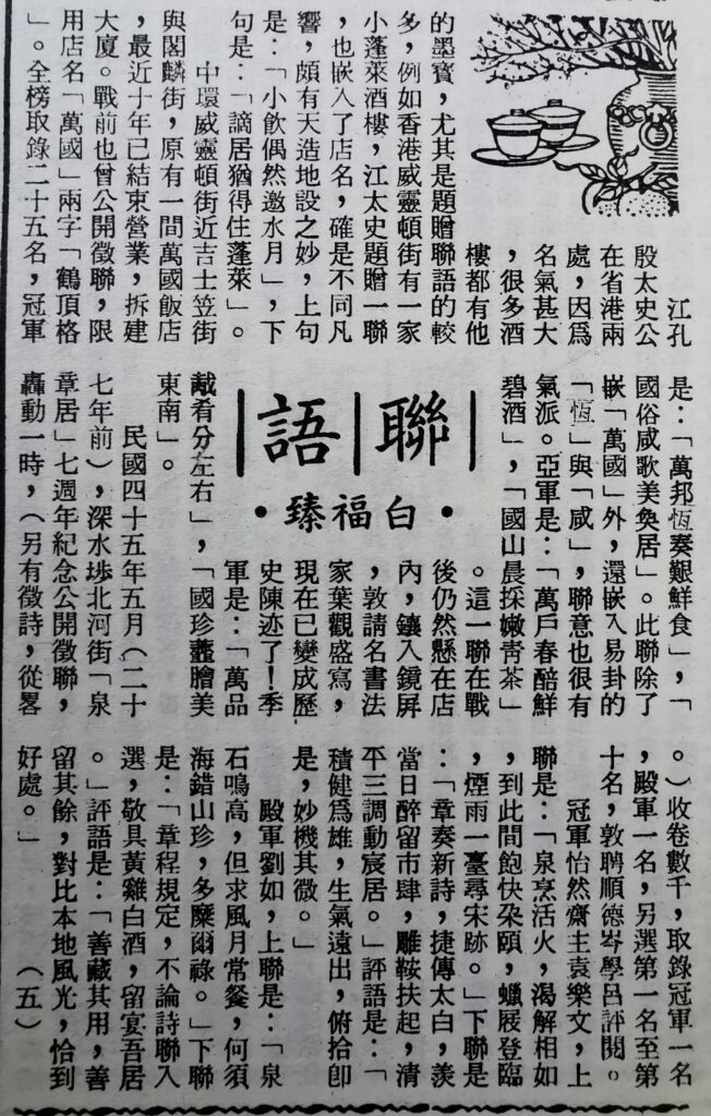 聯貴清新 言有物 發乎情 聲叶字工詞忌砌 謎宜雅俗 創於今 沿自古 格嚴意切句須通 -永遠社長 白福臻 (1924-2011)